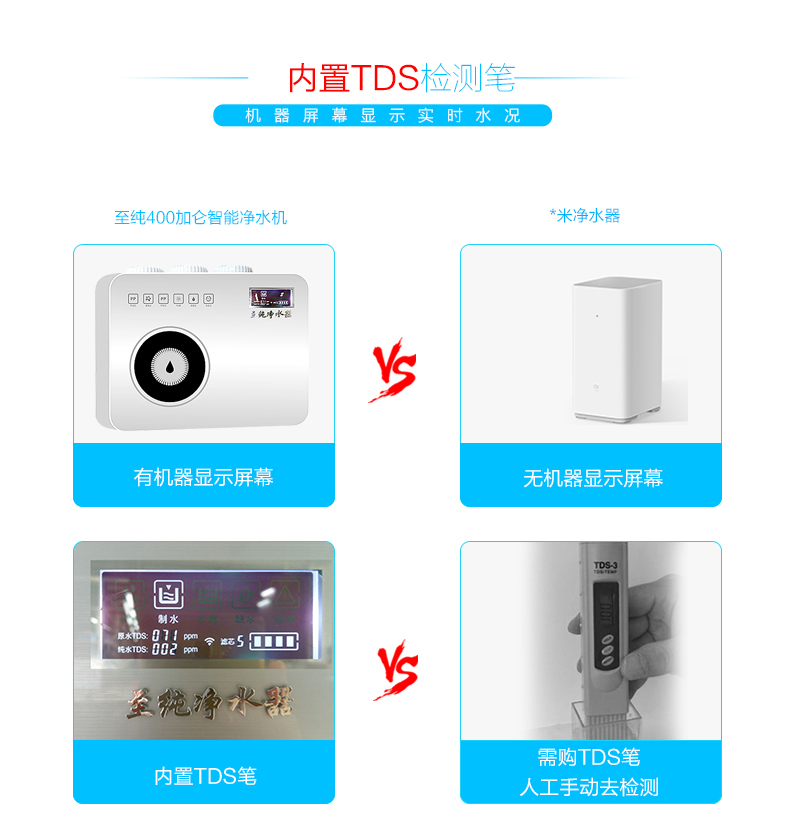 - 產品簡介:至純400加侖反滲透智能凈水機,無桶大流量設計,內置TDS筆,并且與手機APP相連,是國內頂級的家用純水機。